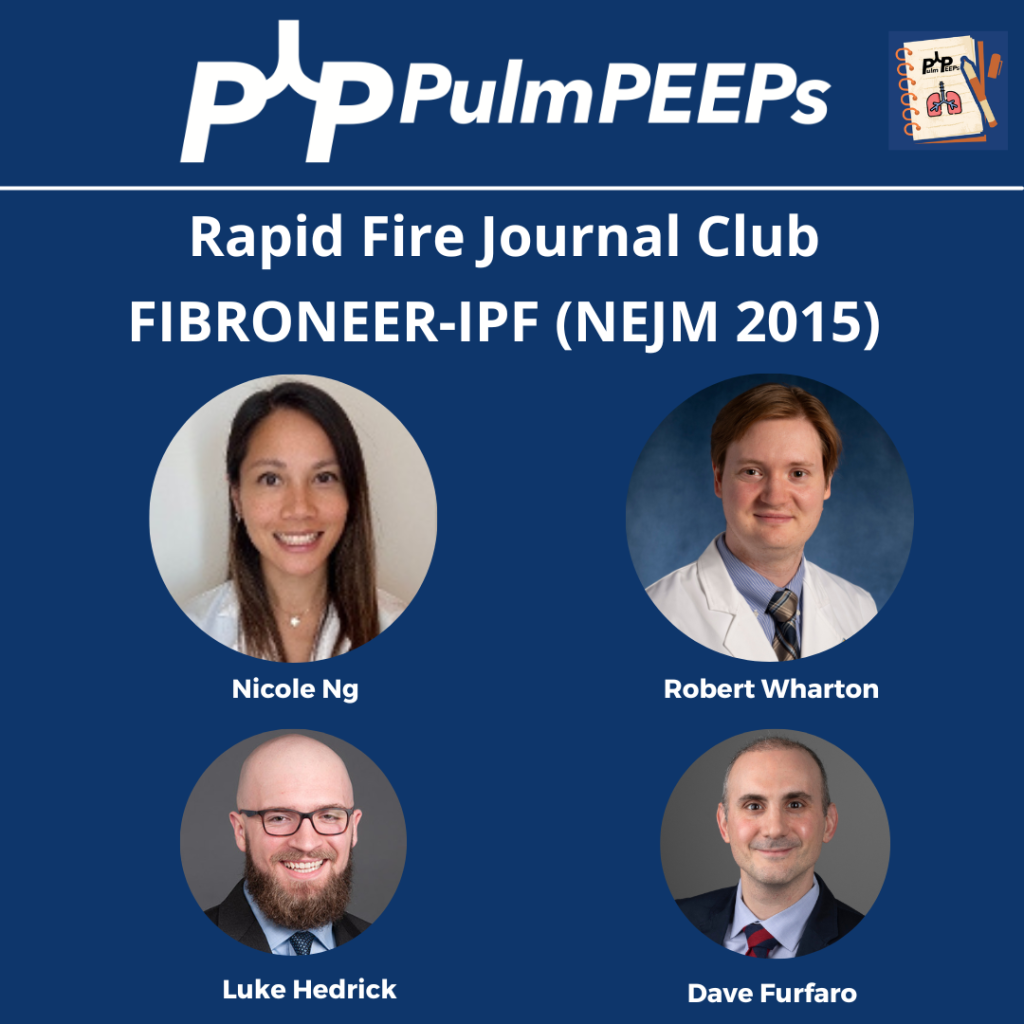 Luke Hedrick, Dave Furfaro, and recurrent RFJC guest Robert Wharton are joined again today by Nicole Ng to discuss the FIBRONEER-IPF trial investigating Nerandomilast in patients with IPF. This trial was published in NEJM in 2025 and looked at Neradomilast vs placebo for treating patients with IPF, on or off background anti-fibrotic therapy. This agents is now FDA approved for pulmonary fibrosis, and understanding the trial results is essential for any pulmonary physician treating patients with IPF or progressive pulmonary fibrosis.