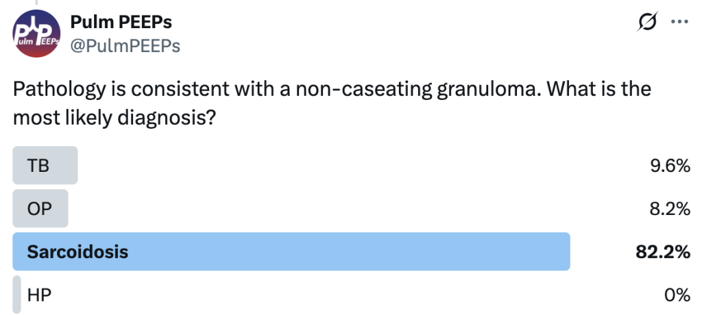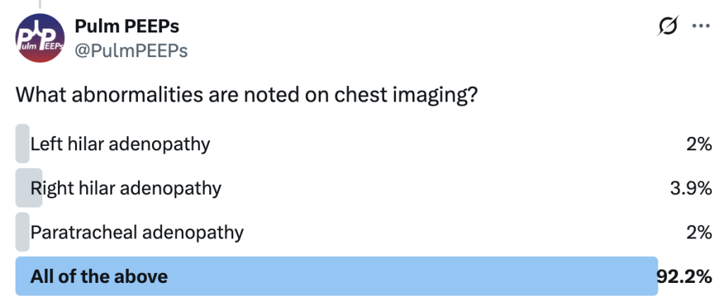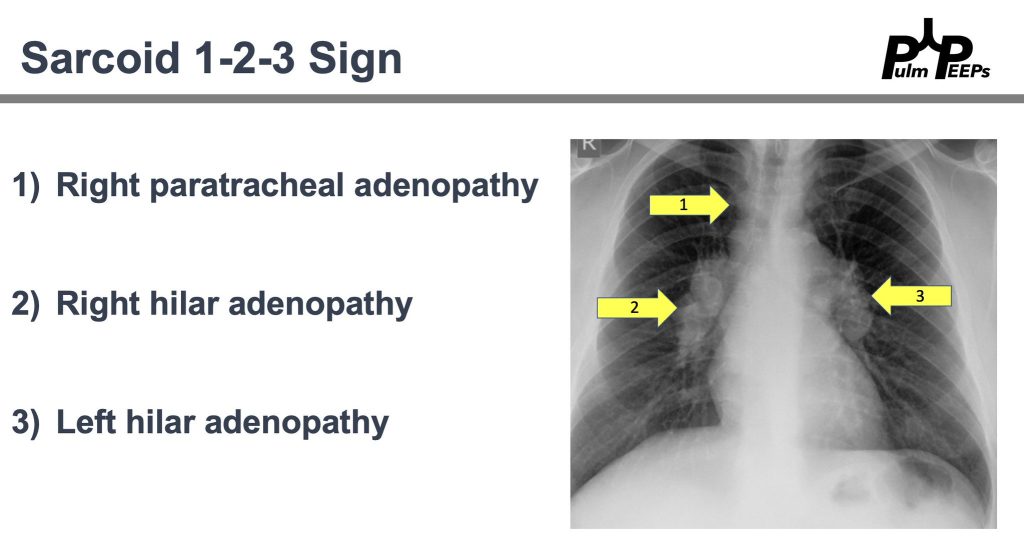 Imaging and pathology were consistent with sarcoidosis and after negative work-up for alternative causes. The patient will follow-up with outpatient pulmonary for sarcoidosis management. Don’t forget about the Sarcoid 1-2-3 sign!