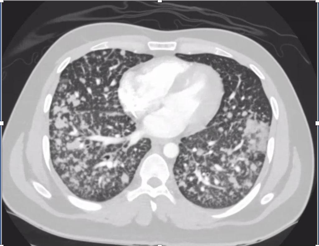 - Young (26), subacute → chronic dyspnea/cough with diffuse pulmonary nodules; avoid premature closure on TB.